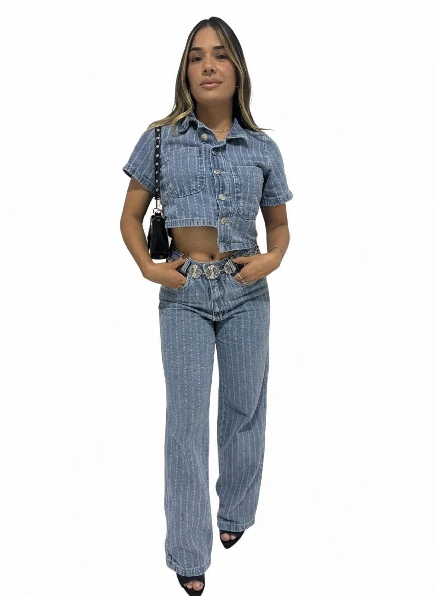 Modelagem wide leg em jeans com listras no próprio tecido, perfeita para alongar a silhueta e garantir estilo em qualquer ocasião. Confortável e versátil, é a escolha ideal para quem ama um look moderno e cheio de personalidade. Combine com a Jaqueta Listra Jeans e monte o conjunto completo. 💙👖